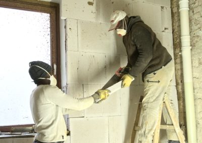 - In den noch feuchten Lehmputz werden Multipormineraldämmplatten gesetzt.