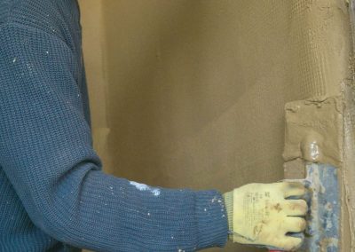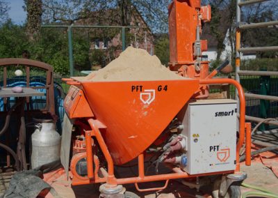 Auf Putzträgern wie Schilfmatten, Mineraldämmplatten, Holzweichfaserplatten oder Heraklithplatten ist ein zweilagiger Putzaufbau erforderlich. Unser Lehmputz ist rein mineralisch, setzt sich also aus natürlichen Bestandteilen zusammen und ist daher vollständig ökologisch abbaubar. Er lässt sich als Siloware mit einer Mischpumpe direkt an die zu bearbeitende Wand sprühen. Durch Abziehen mit der Putzschiene, Reiben und Filzen entsteht eine feine, streichfertige Oberfläche.