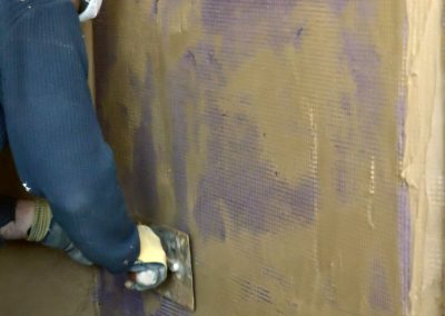 - Der Lehmputz wird mit einem Armierungsgewebe versehen, um Rissen vorzubeugen.